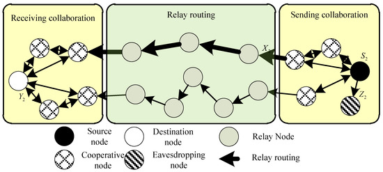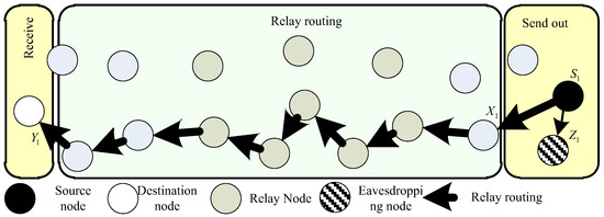 The information transmission process in VANET was divided into three stages: sending, relay routing, and receiving. We then discussed its safety performance. Figure 5 shows the information transmission process in which the transceiver was a single node. The source node transmitted the information to the receiving node through the relay route. The information received by the first relay routing node was , the information received by the malicious eavesdropping node was , and the information received by the receiving node was . According to the existing theories, the capacity of safe channel is: