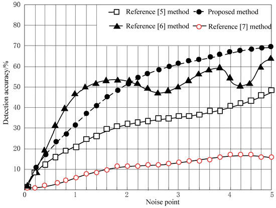 According to the analysis of Figure 7, for different noise points, the methods of References [5,6,7] and this paper had different accuracy rates of traffic flow parameter autonomous detection. The highest accuracy of the Reference [5] method was 49%, the highest accuracy of the Reference [6] method was 65%, and the highest accuracy of the Reference [7] method was only 15%. In comparison, the highest accuracy of this method was 70%, which was higher than the traditional method. An analysis of the trend of several methods shows that the method in this paper had the largest growth. From the above analysis, it can be seen that the accuracy of traffic flow parameter detection results obtained by this method was higher under different noise interference, which shows that this method can reduce the interference caused by noise and the detection results are more reliable.