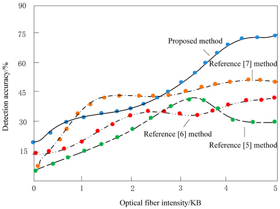 According to Figure 8, under the interference of different intensities, the accuracy of independent detection of traffic flow parameters of different methods was different. On the whole, the higher the light intensity, the lower the accuracy of different methods. However, the accuracy of this method was still higher than that of the traditional method, which shows that the degree of light interference of this method was low and it can get reliable detection results.