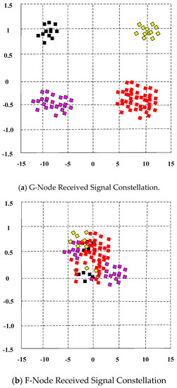 Figure 9a shows the constellation diagram of receiving traffic flow signals by destination node G. Figure 9b shows the constellation diagram of receiving traffic flow signals by malicious node F. Due to the role of channel pre-equalization, the constellation diagram of node G is clear and distinguishable, while the constellations of node F are mixed and disorderly, and the useful traffic flow signals cannot be distinguished. The bit error rate was high. Therefore, it is known that the channel capacity of destination node is larger than that of the malicious node, so that a certain of secure channel capacity can be obtained. Based on this secure channel capacity, the data at the physical layer can be transmitted safely through secure channel coding. For this reason, the proposed method chooses node G to realize the data transmission of traffic flow.