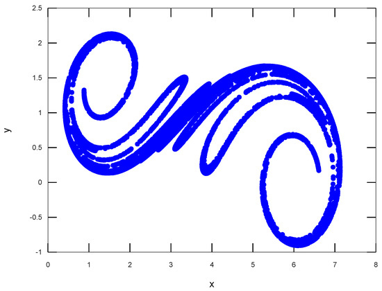 We consider plaintext P with byte length of L. The initial values and from Equation (4), and an initial iteration number , are determined. The rotation–translation formula, Equation (4), is iterated for times.