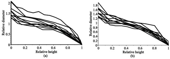 Relative stem diameter plotted against relative height: (a) Measurements of 10 observed trees from the estimation data set and (b) measurements of 10 observed trees from the validation data set.