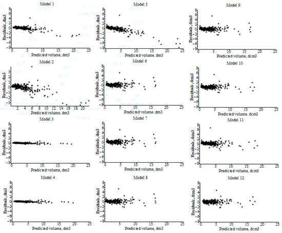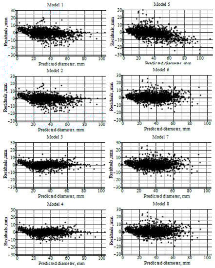 Visualizations of the residuals plotted against the predicted diameters (see Figure 3) show that volume prediction using SDE stem taper models (1–4; extra integral by Equation (33)) produced more homogeneous residual variance than the regression stem taper models (5–8; extra integral by Equation (33)) and the volume regression models (9–12). The inclusion of random effects was found to be considerable for the volume predictions of Models 3 and 4.