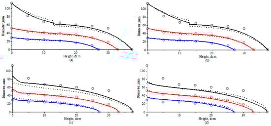 Illustration of all presented stem taper equations: (a) stochastic differential equation (SDE) stem taper Models 1 and 3: mixed-effect Model 3, solid line; fixed-effect Model 1, dotted line. (b) SDE stem taper Models 2 and 4: mixed-effect Model 4, solid line; fixed-effect Model 2, dotted line. (c) Regression stem taper Models 5 and 7: Model 5, solid line; Model 7, dotted line. (d) Regression stem taper Models 6 and 8: Model 6, solid line; Model 8, dotted line. First stem, black colour; second stem, red colour; third stem, blue colour. Observed stem measurements are circles in all subfigures.
