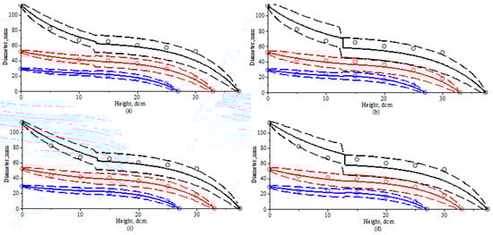SDE stem tapers curves and 0.025 and 0.975 quantiles: (a) SDE mixed-effects Model 3. (b) SDE fixed-effects Model 1. (c) SDE mixed-effects Model 4. (d) SDE fixed-effects model 2. Quantile curves are dashed for all subfigures. First stem, black colour; second stem, red colour; third stem, blue colour.