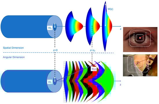 Figure 2 schematically represents the propagation of the TEM00 mode as a function of distance to the light source in the optical axis-z in both spatial and angular dimension. As it can be observed, in the spatial dimension, the form of the intensity corresponds to a Gaussian curve and, thus, the TEM00 laser beams are known as Gaussian beams. Additionally, it can be appreciated that the boundaries of the beam are located around the optical axis, and expands as the beam gets further along in it. The beam waist W0 and the beam width W(z) are also depicted in Figure 2. As described by Equation (6), the beam diameter of the TEM00 mode is defined as the separation from the center of the beam, where the maximum intensity is always achieved, to the point where the power percentage corresponds to 86.47% approximately. In addition, it can be appreciated in Figure 2 that the beam waist corresponds to the beam width at the light origin.