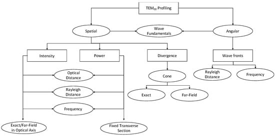 TEM00 mode with Gaussian beam applications are included within those of paraxial waves. Paraxial waves are of relevance in applications where it is necessary to achieve the propagation of light in free space not only with a spatial confinement, but also with an angular confinement. Spatial confinement refers to the characteristic of the wave of being limited to a specific region of space while the angular confinement corresponds to the condition of the normal directions to the wave fronts that imposes small angles with the optical axis or axial axis z. In this way, the beam power is concentrated in a small cone around the optical axis. There are different parameters describing the light beam both in terms of spatial and angular behavior, joined to different concepts of intensity, power, divergence and wave fronts. In diverse application areas ranging from medicine, e.g., ophthalmic laser surgery [], to industry, e.g., fusion and material drilling [], and military applications, e.g., weapons and signals detectors, the correct understanding of the beam parameters is critical for its design and use. Furthermore, the precise understanding of the light source parameters associated to the performance of the laser source is relevant to detect the need for tuning and profiling of the beam equipment, which is typically related to the measurement of symmetry and smoothness [].