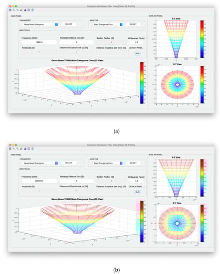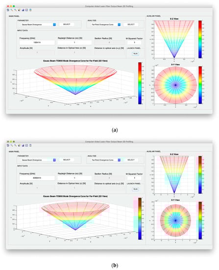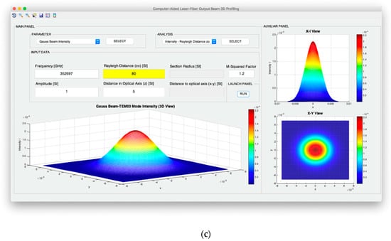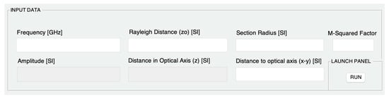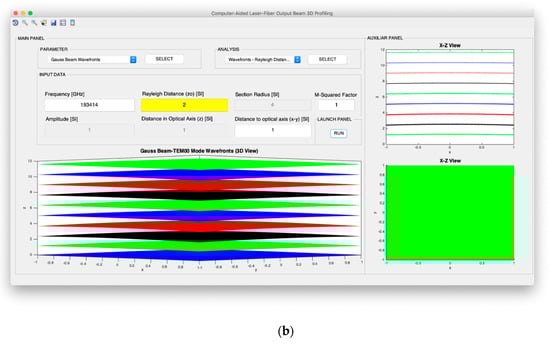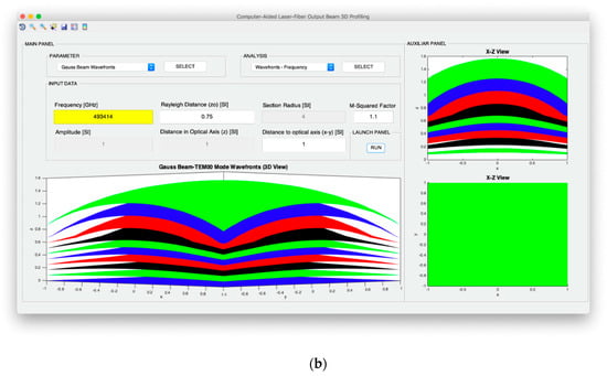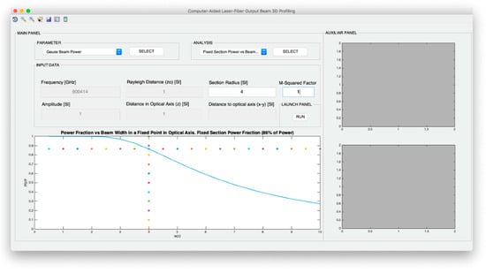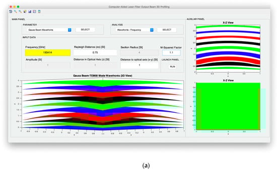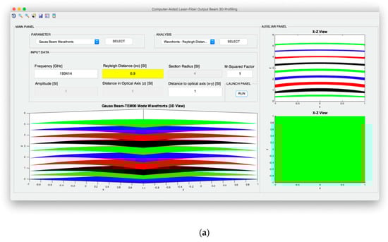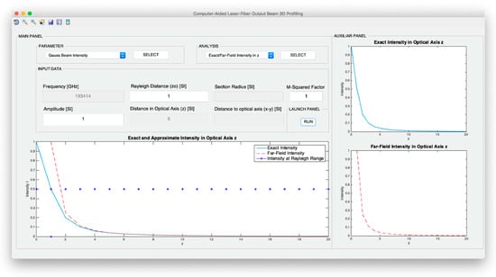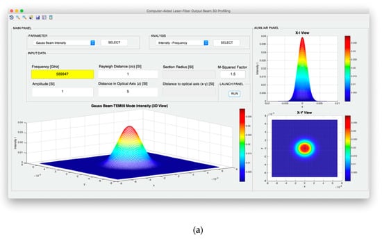 Figure 6 illustrates the parameter selection and analysis panels with all available options. As it can be observed, each parameter study is associated with various options in the analysis panel including all the choices specified in Figure 3 regarding intensity, power, divergence, and wave fronts. Thus, in total, the spatial and angular beam designer allows working with 16 profiling options. Additionally, Figure 7 shows the data entry panel that, as introduced in the previous section, is composed of the information: frequency, amplitude, Rayleigh distance, distance on the optical axis, the radius of the fixed section, the distance around the x–y axes, and the M2 factor. It should be noted that, depending on the type of parameter and beam analysis to be designed, the tool automatically enables those parameters and, furthermore, the factor that must be adjusted successively to achieve optimization is highlighted. The launch panel for the execution of CATEM00 is also shown in Figure 7.