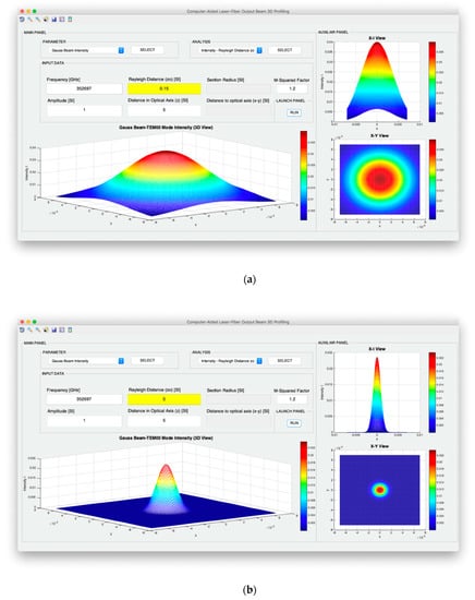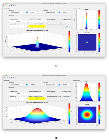 Additionally, the proposed Gaussian beam profiler allows the simulation and study of the intensity in relation to the depth of the focus (2z0) or Rayleigh distance (z0) of the light source. Figure 9 presents three outputs of the proposed profiler, representing the Gaussian beam intensity in a fixed position of the beam axis and a fixed frequency varying the Rayleigh range (0.15 m, 5 m, and 80 m). It can be studied that if z0 decreases or increases from the considered distance in the optical z-axis, the focality of the light source is decreased, which means that the resulting Gaussian beam intensity profile is the narrowest when z0 = z. Hence, in z0 the highest focality is achieved for the TEM00 mode.