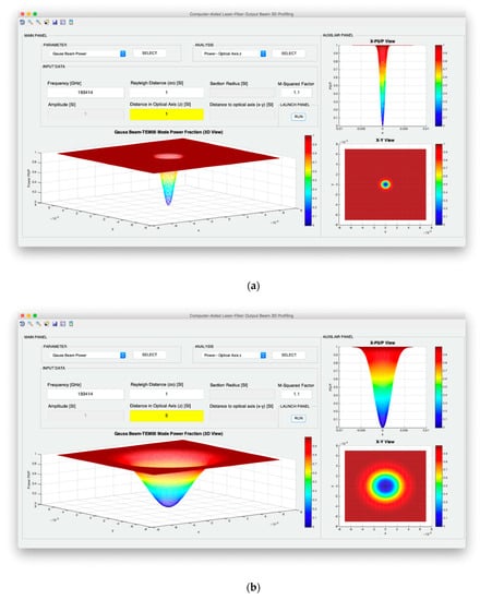 There exist deviations from theoretical Gaussian beams in the output of real-life lasers and fibers that are also considered in the proposed tool [,,,]. For example, low-power light beams from helium neon lasers can be a close approximation to TEM00, but it must be noted that as the power of the light source becomes higher, the pumping mechanism becomes more complex and the order of the emitted mode becomes higher and thus, the more the beam deviates from the ideal TEM00. Indeed, although the beam from a well-controlled helium neon laser and other gas lasers is very close to that of a theoretical TEM00 mode, for most lasers, even specifying a TEM00 mode, the output contains some components of higher-order modes that do not propagate according to the theoretical TEM00. Hence, it is necessary to introduce in the proposed tool these deviations from the theoretical Gaussian beam.