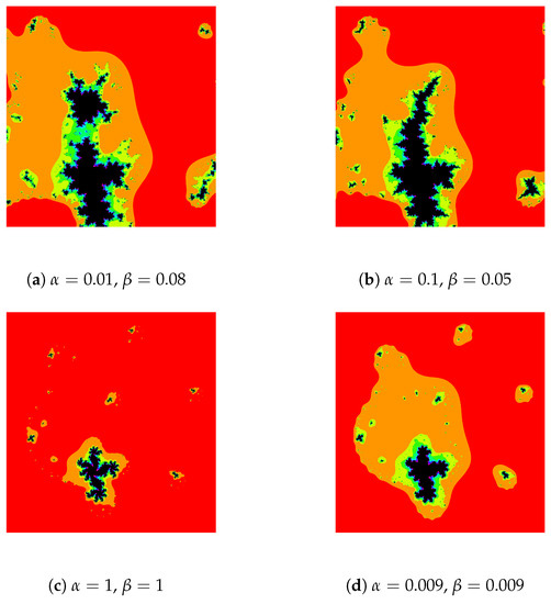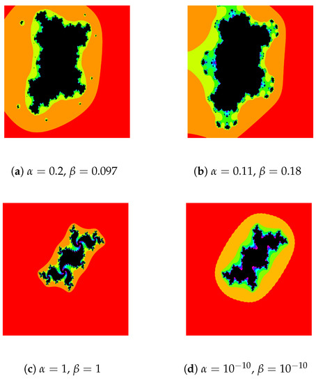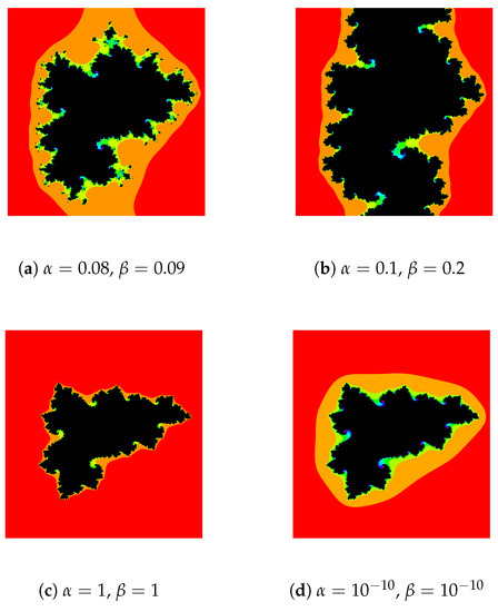 - For Figure 1, we consider the polynomial and . It is easy to see that T has one attracting fixed point, . Observe that for , and , we obtain different images due to color variation caused by parameters. It is interesting to note that for , and , we have similar shapes but there is clear variation of colors.