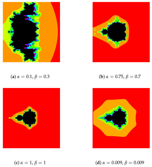 For Figure 4 we input and observe that for and , the shape is stretched and the bulb is wider and for and the shape is compact with defined bulb. Notice the variation of colors for Mandelbrot sets for , and , . Also, observe that Mandelbot sets generated are symmetric about origin.