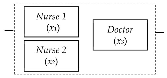 Let us consider the analysis of medical errors by a simple demonstration. In this example, a medical error system comprises the mistakes of two nurses and one doctor. The error estimation can be implemented as an analysis of the system of three components (n = 3) (Figure 2). Let us interpret this system in terms of MSS and introduce numbers of states for every component and number of the system performance levels. Let the system have three performance levels (M = 3): 0—non-operational (the fatal medical error); 1—partially operational (some imperfection in patient care); and 2—fully operational (patient care without any complication). Two components x1 and x2 (that are interpreted as nursing mistakes) have only two possible states (m1 = m2 = 2): error (state 0) and absence of error (state 1). The doctor’s mistake can be modeled according to four levels (m3 = 4) (i.e., from 0 (fatal error by the doctor) to 3 (doctor’s work is perfect)).