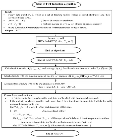 Thus, the criterion for finishing the FDT branch as a leaf occurs either when the frequency f of the branch is below α, or when more than β percent of instances are left in the branch with the dominant value of the target attribute. These values are thus the key parameters that are needed to determine whether we have already arrived at a leaf node or whether the branch should be expanded further. Decreasing parameter α and increasing parameter β allows us to build large FDTs. On one hand, large FDTs describe datasets in more detail. On the other hand, these FDTs are very sensitive to noise in the dataset [30]. We empirically select parameters α = 0.15 and β = 0.80. In practical applications, the optimal values of these parameters depend on the dataset and their values can be obtained experimentally. We estimate that a certainty degree of more than 0.80–0.90 would allow us to reach a sufficient decision. Moreover, the threshold frequency 0.10–0.15 eliminates the variants of no-principal situations. Notably, increasing the size of the FDT has no influence on the FDT root or the next FDT nodes, it merely adds new nodes and leaves to the bottom part of the FDT. These new nodes and leaves have a low bearing on decision-making. The considered algorithm for FDT induction is shown in Figure 3.
