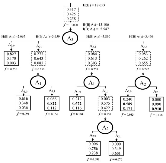 The attribute A3 has the maximum value of information estimation (Equation (2)). Therefore, this attribute is associated with the FDT root (top node). The data analysis starts with this attribute. This attribute can have the following possible values: A3,0, A3,1, A3,2 and A3,3. The value of attribute A3,0 stipulates target attribute B to be B0 (the system is non-operational) with a certainty degree of 0.827. The other variants B1 and B2 of target attribute B can be chosen with a certainty degree of 0.170 and 0.003, respectively. Frequency f for branch A3,0 is calculated as M(A3,0)/12. The result equals 3.0/12 = 0.250. This frequency f = 0.250 shows the possibility of an occurrence of values A3,0 when measuring the value of input attribute A3. The certainty degree of 0.827 for the value of B0 is more than β = 0.80; therefore, we stop the process of constructing the FDT for this branch.