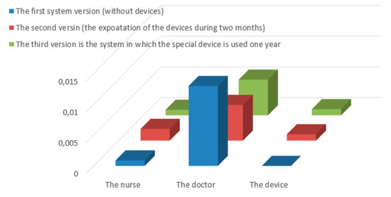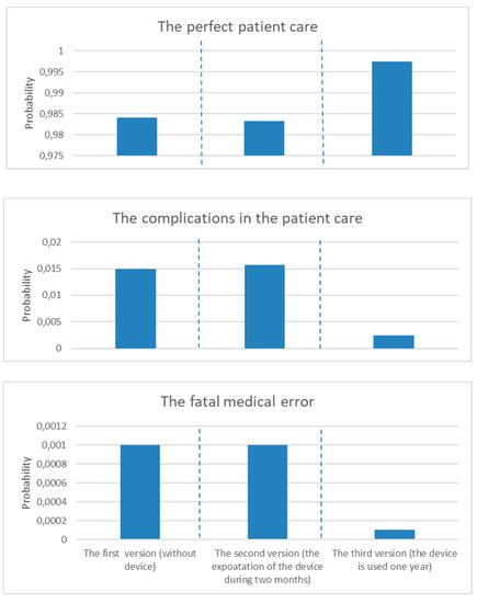First of all, the probabilities of the system performance levels were computed according to Equation (6), as shown in Figure 6. The diagram in Figure 6 shows the probabilities of the system performance levels on the y axis for three version of the system. According to these diagrams, application of the device did not have a good influence on patient care during the first two months. The error number (bottom diagram) did not change; the number of the complications (middle diagram) slightly increased (the difference of these probabilities is 0.0008) and the number of perfect cases (top diagram) decreased. The application of the device in the first two months caused an insignificant decrease in the amount of perfect patient care. The probability of perfect cases for the second system version was less, at 0.0008. The number of medical errors did not increase within two months of using a jaundice meter, which is a good result. The essential influence of the new device’s application on patient care was discovered after one year—the number of medical errors decreased and the number of perfect cases of patient care increased. The probability of perfect cases of patient care increase was 0.01, and probability of medical error decreased to 0.001. The proportional changes of these probabilities are illustrated in diagram in Figure 7. The fatal medical errors for the first version of the system had maximal proportion in comparison with the two other versions of this system. Therefore, the usage of new devices had a positive influence on the reduction of medical errors in the considered system. The accuracy of these results was the result of the FDT induction discussed in Section 5 for different datasets according to the ratio of the number of incorrect values for the constructed structure function.