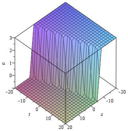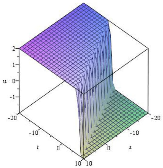 - We assume that the solution of Equation (24) is written in the following formwhere k is an integer, which is determined by balancing the highest order derivative terms with the nonlinear terms in the resulting equation. After determining k, putting Equations (26) and (27) into Equation (24), we get a polynomial concerning . Then we collect all terms of and make each of them equal to zero, which obtaina the algebraic equations containing unknown numbers and c. Solving these equations, we get the values of unknowns. Finally, plugging these values into equations, we derive exact solutions of equations.