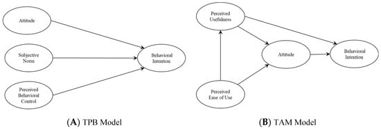(A) Theory of Planned Behavior (TPB) model; (B) Technology Acceptance Model (TAM) model.