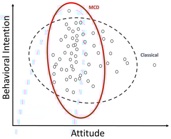 In the PLS procedure, a Pearson correlation matrix is a relevant input, even though Pearson estimates are highly sensitive to unsystematic outliers, which can finally conclude in distorted PLS results. To cope with this shortcoming, Schamberger et al. proposed using a robust correlation coefficient to define a robust PLS []. The minimum covariance determinant (MCD) was central to their approach []. The MCD estimator is a highly robust estimator of multivariate location and scatter, being the one with the highest asymptotic breakdown point (BP), see Figure 3. The MCD is designed for elliptically symmetric unimodal distributions. The MCD has been used to develop robust multivariate techniques, such as principal component analysis, factor analysis, and multiple regression []. In summary, the MCD coefficient estimates the variance-covariance matrix of a sample set based on a subsample of the total observations with the smallest positive determinant. The robust PLS algorithm uses the MCD correlation as an input, maintaining unaltered the subsequent PLS steps, and therefore confronts the outlier issues without removing them from the sample set [].