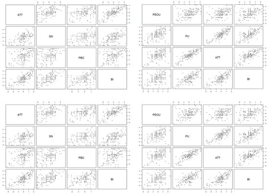 The plot of the score values for the two models. Traditional consistent partial least squares path modeling (PLSc) at the top and robust PLSc at the bottom. ATT, attitude; SN, subjective norms; PBC, perceived behavioral control; BI, behavioral intention; PEOU, perceived ease of use; PU, perceived usefulness.