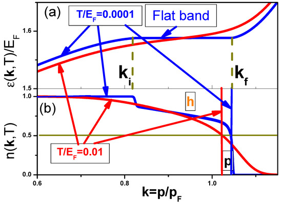 Figure 1. Quasiparticle spectrum (a) and occupation number (b) for the FC phase vs dimensionless momentum k = p / p F . Reported is the case of very small ( 10 4 E F 10 2 E F ) temperatures; p F and E F are Fermi momentum and energy respectively [1,6]. Vertical lines (red and blue for temperatures shown in the panels) in panel (b) correspond to E F where n ( k , T ) = 0.5 (horizontal line). In the panel (a), at k i < k < k f (marked by dashed horizontal lines with k i and k f standing for initial and final momenta respectively) and T = 0.0001 E F (blue curve), ε ( k , T ) is almost dispersionless and marked “Flat band”. Latter implies that the density of states N 0 in the range k f k i . The occupation number n ( k , T ) develops more asymmetry relatively to E F so that C invariance is broken, yielding NFL regime. To illustrate the asymmetry, the area in panel (b), where holes are “living”, is labeled “h” (in red color), while that for quasiparticles, by “p” (in black color).
