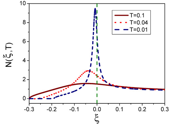 Figure 2. Function N ( ξ , T ) ( ξ = ( ε μ ) / μ ) for three values of T (normalized to μ ) shown in the legend [1,6].