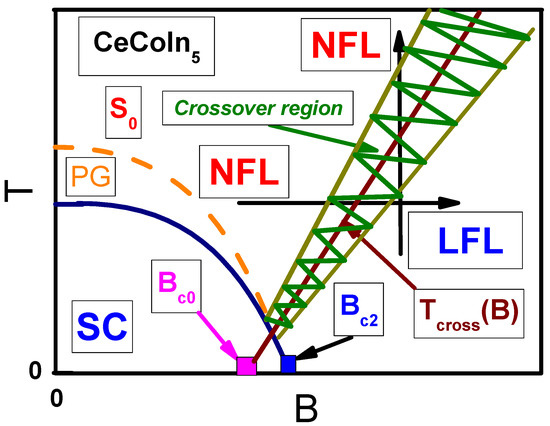 Figure 3 shows the schematic T B phase diagram for CeCoIn 5 . The main point is that a magnetic field B c 0 induces QCP. This field, in turn, lies deep inside the superconducting part of the phase diagram [35]. It is clearly seen from Figure 3 that B c 2 > B c 0 [36,37] so that ordinary Fermi liquid properties exist at T T c r o s s until the superconducting phase begins to appear. Latter phase destroys normal state entropy surplus [1].