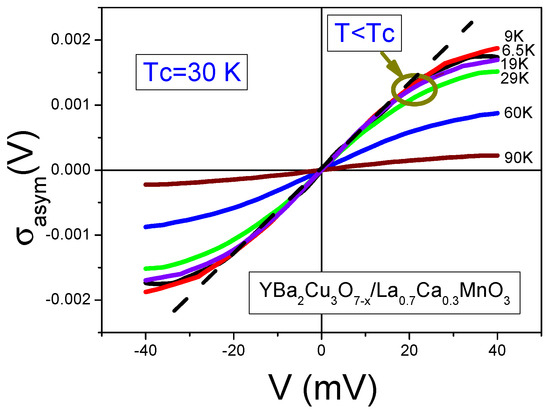 Figure 4. Temperature dependence of the asymmetric part σ a s y m ( V ) extracted from measurements on YBa 2 Cu 3 O 7 x / La 0.7 Ca 0.3 MnO 3 bilayers of the differential conductivity at different temperatures shown in the figure [41]. The dashed line shows the linear dependence of σ a s y m ( V ) on the variable V over a wide range, see Equation (15).