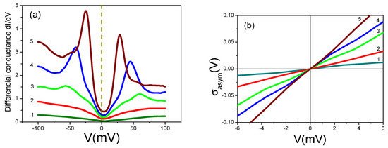 Figure 5. Spatial variation of the spectra of the differential tunnel conductivity obtained in measurements on Bi 2 Sr 2 CaCu 2 O 8 + x . (a) Lines 1 and 2 belong to regions in which the integrated local DOS is very low. Low differential conductivity and the absence of the gap are vivid features that we are dealing with a bad metal. Line 3 indicates the large gap (65 meV) with mildly pronounced peaks. The integrated value of the local DOS for curve 3 is rather small, but is larger than that for lines 1 and 2. Line 4 depicts the gap of about 40 meV, which is close to the average value of the gap. Line 5 corresponds to the maximum integrated local DOS, and depicts the smallest gap of about 25 meV, and has two well pronounced coherent peaks [42]. (b) The asymmetric part σ a s y m ( V ) of the differential tunnel conductivity in the high- T c superconductor Bi 2 Sr 2 CaCu 2 O 8 + x , extracted from the data exposed in Figure 5a, as a function of the voltage V (mV). The lines are numbered in accordance with the numbers of the curves in Figure 5a. Evidently, σ a s y m ( V ) is a linear function of V, while the slope of σ a s y m ( V ) is inversely proportional to the gap size Δ 1 , see Equation (15).