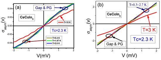 Figure 6. The asymmetric part σ a s y m ( V ) in CeCoIn 5 . Panel (a). The asymmetric part is extracted from the experimental data [16]. It is seen that at T 2.6 K CeCoIn 5 in both its PG state and the SC state, σ a s y m ( V ) becomes temperature independent; T c = 2.3 K is the superconducting phase transition temperature. Panel (b). The asymmetric part σ a s y m ( V ) is extracted from the experimental data [43]. Again, at T 2.7 K CeCoIn 5 in its PG and SC states, and the asymmetrical part σ a s y m ( V ) becomes temperature independent, see Equation (15). At T 2.7 K σ a s y m ( V ) diminishes, as it follows from Equation (13).