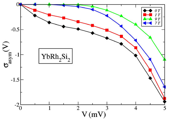 Figure 7. The asymmetric part σ a s y m ( V ) at different applied magnetic fields, shown in the legend. Asymmetrical part σ a s y m ( V ) is extracted from the experimental data [27]. At B 7 T σ a s y m ( V ) vanishes at V 2 mV , for at these magnetic fields the system exhibits the LFL behavior, as seen from the phase diagram in Figure 3.