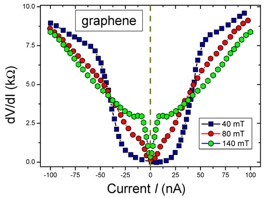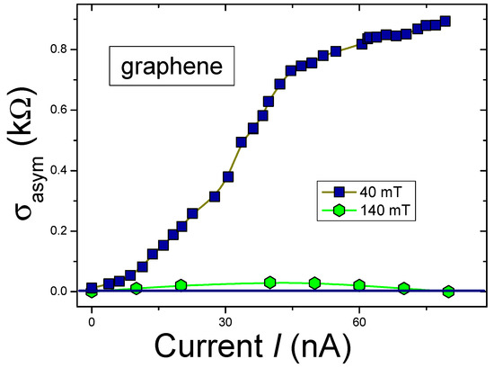 Figure 9. The asymmetric part of the differential resistance σ a s y m ( k Ω ) = d V / d I ( I ) d V / d I ( I ) is extracted from experimental data, obtained in measurements on graphene [18] and provided in Figure 8.