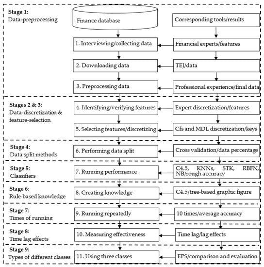 Recently, a varied function of emerged linear and nonlinear ML techniques [55,56] in advanced soft computing algorithms such as DT-C4.5, the KNN algorithm, ensemble STK, RBFN, and NB, other than the nonlinear support vector machine, multilayer perceptron, and the linear logistic regression, has been used as an important research approach for both academicians and practitioners due to their superior past performance and has been well studied, with a wide application field with beneficial effects. Therefore, past prominent capability is very worthy of being a starting point to a study and overview of the linear or nonlinear comparative studies for further research work. In view of these interesting facts for modeling classification works [57,58], they are used as the basis for the complete construction of the study framework. There are nine components (stages), with 11 detailed steps for raising the advantages and rationalities of this study. (1) Data-preprocessing: This component is used to build a tangible benefit from the reviews of literature and experts from a specific database. (2) Data-discretization: The discretization facilitates the use of data from the view of natural language and improves classification accuracy. (3) Feature-selection: This core technique is used to lower data dimension and complexity to speed the benefits of operating experiments. (4) Two data-split methods: The different data-split methods are used for comparison of the review of practical datasets in the same environment. (5) Machine learners: Different classifiers are assessed and compared to discover the best suitable tool for EPS financial diagnosis. (6) Rule-based DT knowledge: The decisional rules generated by the DT-C4.5 algorithm are used for constructing the instructions of the “IF…THEN…” form used to help define a better choice to achieve a specific goal. (7) Different times of running experiments: It has the advantage of determining the performance of various classifiers with the same given data. (8) Time lag effects: The lag effects of different time periods are measured to understand whether the financial data consider a substantial time-lag effect demonstrated by the given data as well as to identify the right time lag. (9) Types of different classes: The merit of measuring different classes is used to define the performance difference of various classifiers. Mainly, the nine major stages systematically detail the computing processes to support a further clear definition, which is described in Figure 1, to present a flowchart of the applied hybrid models proposed to represent data relativity, with the corresponding tools and steps for experiencing the empirical outcomes (results) of EPS.