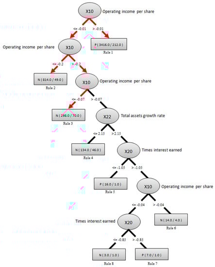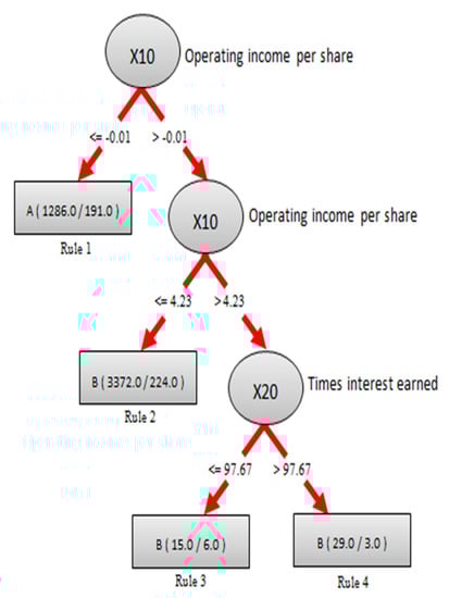 First, financial data are continuous and of a big volume. Pal and Kar [68] suggested using the data-discretization technique to improve classification performance. Data-discretization could reduce the number of generated classifying rules, enhance the performance of classifiers, and ease the semantic representation. This study, through model performance comparison and the illustration of decision rule-based knowledge, confirmed Pal and Kar’s study [68].