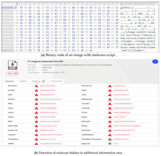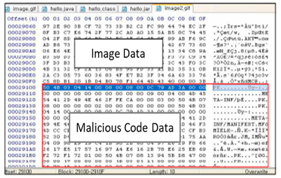 Figure 1 shows malicious code data that are hidden in an image file. Image files (BMP, JPG, PNG, etc.) usually have a header at the beginning of the file, followed by the actual data. The image format is normally configured using this image file structure. Hiding techniques, such as those that add a malicious binary code or malicious code script at the end of the image data, insert a malicious code script into the additional information area of the image file format, or hide a malicious code in the image data area, are known to exist [11,12,13].