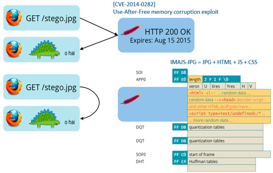 - Saumil, S. Stegosploit: Hacking with pictures. In Proceedings of the 6th Annual HITB Security Conference, Amsterdam, The Netherlands, 26–29 May 2015. [Google Scholar]