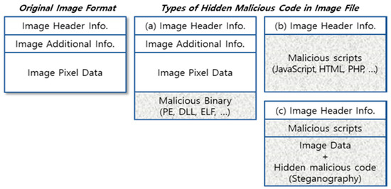 The analysis of types of hidden malicious code is aimed at identifying the area in which malicious code is inserted in the image file structure. A normal image file is configured with three areas: header information, additional information, and actual image data. The structures of image files containing malicious code are shown in Figure 4. Methods whereby malicious codes are hidden in an image with a normal file format structure are designed to insert or modulate these three areas and can be classified into several types.