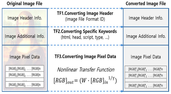 Figure 5 presents a method to convert the areas of an image by using a file extraction step and a format analysis step. The image header information conversion step (TF1) changes the identification signature of the converted image format, and the additional image conversion step (TF2) applies a specific string filtering conversion method. The image pixel data conversion step (TF3) applies a nonlinear transfer function with a specific range value to convert the attribute value of the original image.