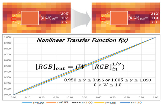 Figure 6 shows an example of the change in the RGB colors of an image after application of the nonlinear transfer function. In this example, the value of one pixel, [RGB]in, of the original image is (205, 107, 66), and the value of the pixel [RGB]out, as converted using the nonlinear transfer function in Equation (1) is calculated as (212, 110, 68). A comparison between the color corresponding to the pixel value of the original image and the color corresponding to that of the converted image shows that the converted pixel is actually indistinguishable from the original pixel.