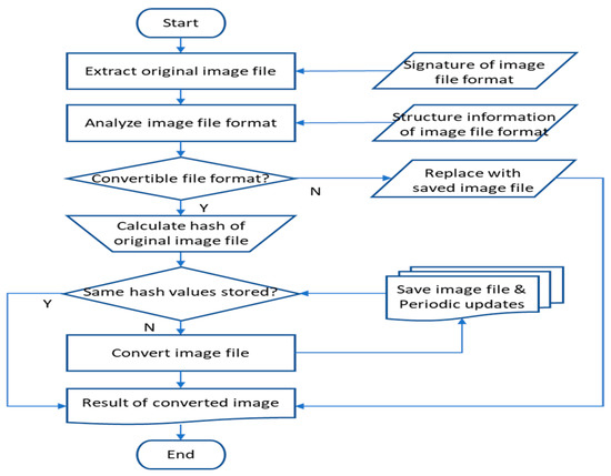 The system is configured with four modules: an image file extraction module, an image file format analysis module, an image file conversion module, and a converged image file management module. Figure 8 shows a flowchart of these processes.