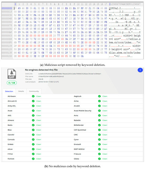 The VT Detection (B) result is the detection result after the proposed neutralization technique was applied to the files containing the hidden malicious code. During this experiment, VirusTotal was used to re-verify that the malicious code had been removed after the original image files (GIF) were converted into other data files (JPG). For example, the Trojan/bgcolor.gif file contained a hidden malicious code in the form of an “iframe” tag. When the corresponding file was tested using VirusTotal, 27 of 59 detection engines determined it to be a malicious file. After our proposed system was used to delete the string value in the additional area of the image file by changing the value of textString HEX (the hex value corresponding to http, iframe, and htm) of the bgcolor.gif file, re-examination of the file by VirusTotal revealed that none of the detection engines found the file to be malicious.