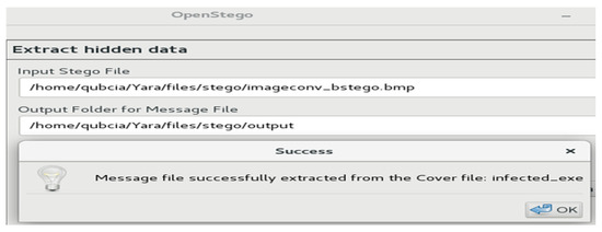 The open steganography software, OpenStego is a well-known tool and has been cited in many research papers [30,31]. OpenStego hides message files, malicious files, confidential information, and other data in the image pixel area of the original image by converting the pixel data values through steganography algorithms. This tool can extract hidden files or information through the steganography algorithm used in encoding. In this study, by determining the gamma value of the nonlinear transfer function, the image quality was verified using OpenStego. Decoding should not be possible, as shown in Figure 13c. If decoding is possible, as shown in Figure 14, a malicious code can be executed again. This case occurred when the value of γ in the nonlinear transfer function applied to TF3 was not within the range 0.950 < γ < 0.995 or 1.005 < γ < 1.050.