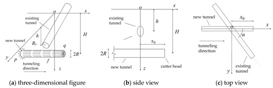 As shown in Figure 1a–c, the central axis of the new tunnel is parallel to the x-axis and passes through the existing tunnel at an angle of α . Also, the intersection of the two tunnel axes is located at point o. The relevant parameters of the new tunnel are the buried depth of the axis (H), the excavation surface position (x0), and the radius of the tunnel (R). The influencing factors involved in the excavation process include the additional thrust (q) of the cutter head, the friction resistance (f) of the shield shell, the additional grouting force (p), and soil loss characteristics. The relevant parameters of the existing tunnel are the buried depth of the axis (h) and the radius of the tunnel (Rs). In this work, we considered the excavation surface position and the tunnel crossing angle (α) to be variable and improved the deficiencies of the calculation method presented in ref [16] to make our calculation method more widely applicable.