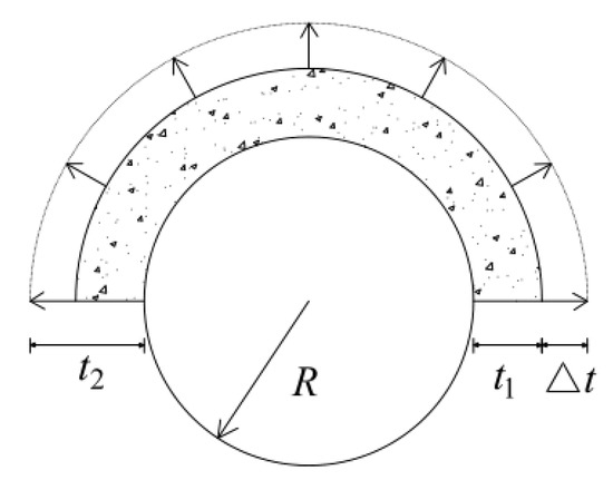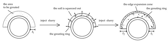 Grouting reinforcement in the soil mainly uses slurry to squeeze the soil and fill the soil voids through infiltration, compaction, and splitting so as to improve the self-stabilization capacity and deformation resistance of the soil. As shown in Figure 2, the original thickness of the area to be grouted is t1. Due to the injection of a large amount of slurry, the voids in the original native body are further filled and compacted. With the continuous increase in the grouting volume, part of the soil in the area to be grouted is squeezed out in the radial direction due to extrusion after the soil voids in the grouting area are filled. When the grouting ring is solidified and stabilized, the extruded soil adheres to the surface of the grouting ring to form an edge expansion zone, and the grouting ring forms grouting and solidification with a thickness of t2. In summary, the influence of the grouting behind the wall on the external soil deformation can be reflected in the volume growth of the grouting affected zone. The volume of the space to be grouted before grouting is V1, and it increases to V2 after grouting; thus, the volume expansion rate (Q) can be expressed through:
