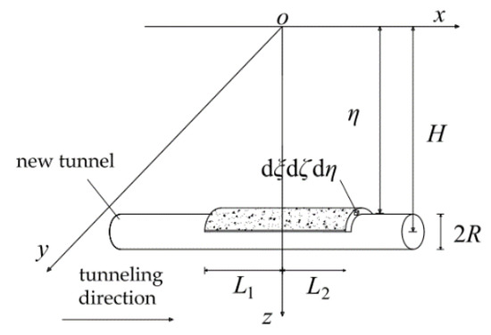 In order to study the impact of the circular grouting of the new tunnel on the upper existing tunnel, the work in this section is based on the stochastic medium theory and the research results of Qi Jingjing et al. [14]. The volume of any calculation unit in the soil is , and its buried depth is equal to η. The displacement of the soil at any point in the upper part caused by the complete collapse of the excavation unit in the vertical direction is given by: