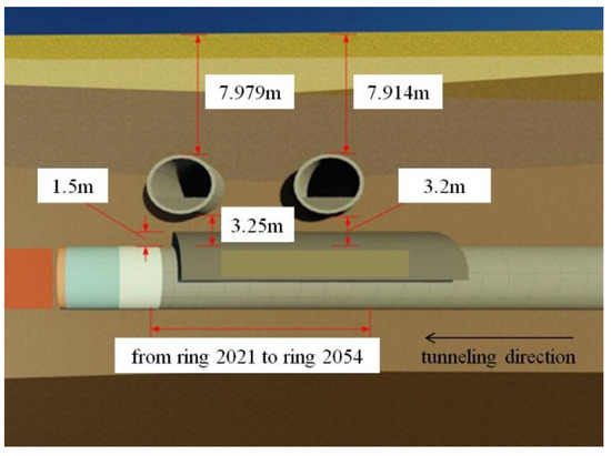 This work takes the example of the project of a new tunnel underneath an existing two-lane tunnel in Hangzhou, China. As shown in Figure 5, the new tunnel is driven from right to left and passes through the upline of the existing tunnel at an angle of 62° and through the downline of the existing tunnel at an angle of 61°. In order to reduce the effect of the tunnel underpass on the settlement of the existing two-lane tunnels, circular grouting will be carried out within the influence range of the existing line after the shield traverses the existing line, thereby forming a semicircular grouting reinforcement ring on the top of the new tunnel from ring 2021 to ring 2054. The thickness and the total length of the grouting ring are 1.5 and 49.5 m respectively. The new tunnel and the existing tunnel are mainly located in the silt layer. Other relevant parameters are listed in Table 1.