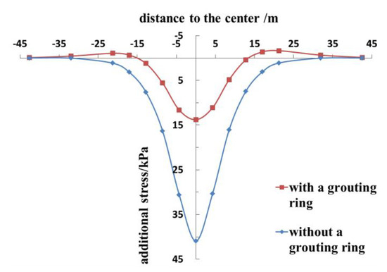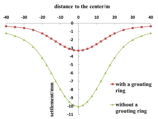 Figure 6 and Figure 7 show the comparison of the additional stress and the settlement distribution curves of the upline with a grouting ring with those without a grouting ring. These two figures show that, first, the grouting ring can significantly reduce the influence of the additional stress on the existing tunnel. Without the grouting ring, the additional stress on the existing tunnel is normally distributed, and the maximum additional stress is 40.92 kPa, which occurs in the crossing center. After the installation of the grouting ring, the overall additional stress is reduced, and the maximum additional stress in the center decreases to 13.79 kPa. Second, due to the impact of the grouting ring, the additional stress on the existing tunnel has a negative value at a distance of 15–30 m from the crossing center and rises vertically, which causes the tunnel to uplift. Third, the installation of the grouting ring can effectively decrease the settlement of the existing tunnels. The maximum settlement across the center declined from 10.03 to 3.3 mm after the grouting ring was installed.
