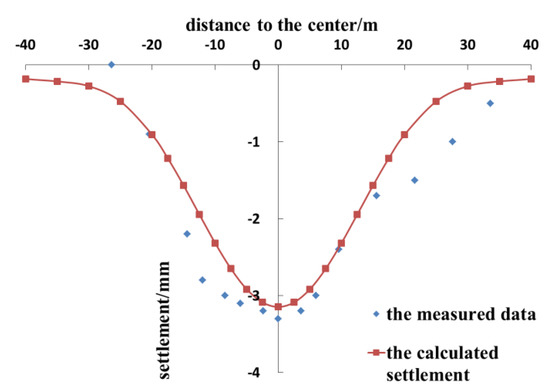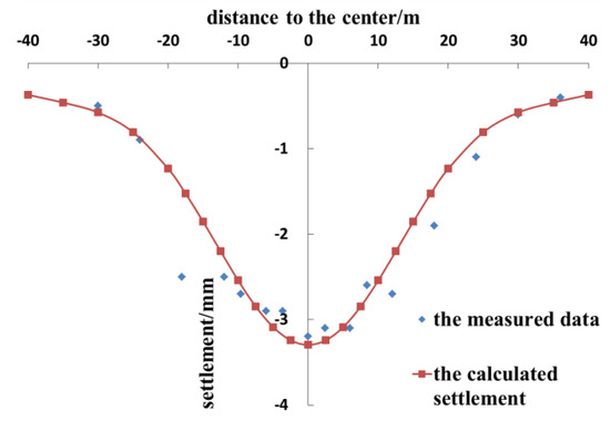 In the calculation process, the shield excavation surface is located at x0 = 40 m, and the volume expansion rate of the grouting ring is 1.58%. Figure 8 illustrates the comparison of the settlement distribution curves of the existing upline. According to the results, first, the settlement curve of the tunnel obtained from the proposed calculation method is roughly in the form of a normal distribution, and the measured settlement data also present a distribution of “large settlement values in the middle and small settlement values at both ends”. Thus, the overall distribution of the calculated settlement is similar to that of the measured settlement. Second, the measured and the calculated maximum tunnel settlement in the crossing center are 3.2 and 3.3 mm respectively, which denotes a difference of only 0.1 mm, thereby fulfilling the accuracy requirement. Third, the range of the settlement of the tunnel figured out by the proposed calculation method is relatively close to the measured range and is approximately symmetrically distributed about the crossing center.