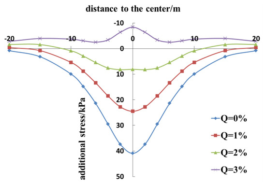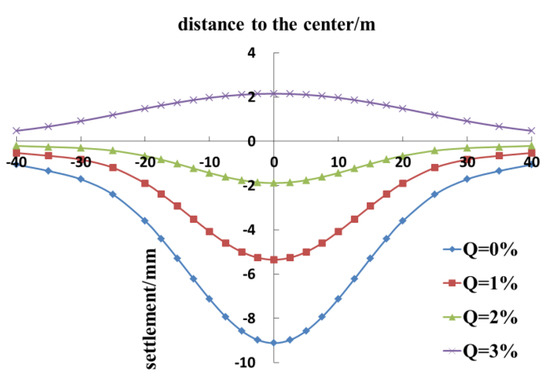 Figure 10 and Figure 11 show the comparison of the additional stress on and the vertical displacement of the existing tunnel at different volume expansion rates. These figures show that, first, when Q is 0%, the additional stress on the existing tunnel is normally distributed, and the maximum additional stress in the center is 40.92 kPa. Second, as Q increases, the force for lifting the existing tunnel, caused by the grouting ring, enlarges, and the total additional stress on the existing tunnel gradually decreases. When Q = 3%, the variation in the additional stress is transformed from a vertical downward trend to a vertical upward trend, indicating that the impact of the grouting ring is greater than that of the tunnel excavation. Third, the vertical displacement of the tunnel under the working conditions follows a normal distribution, and the maximum vertical displacement occurs in the crossing center. When Q is set at 0, 1, and 2%, the maximum settlement value is 9.12, 5.35, and 1.88 mm respectively. Fourth, the volume expansion of the grouting ring can effectively reduce the settlement deformation of the existing tunnel. With the continuous increase in Q, the settlement of the existing tunnel gradually declines. When Q = 3%, the deformation of the existing tunnel shifts from a settlement deformation to an upward bulge, and the maximum bulge in the center is 2.16 mm. Fifth, for this project, the optimal volume expansion rate (Q) should be controlled between 2–3% when the vertical deformation of the existing tunnel is the smallest at this time.
