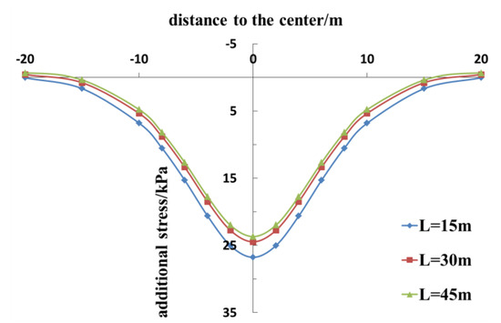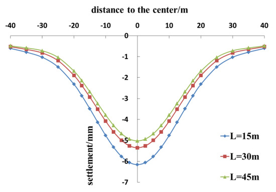 Figure 12 and Figure 13 show the comparison of the additional stress on and the vertical displacement of the existing tunnels at different lengths of the grouting ring. It is clear that, first, at a grouting ring length of 15, 30, and 45 m, the additional stress on and the settlement of the existing tunnel gradually decrease. Moreover, at a grouting ring length of 15, 30, and 45 m, the maximum additional stress occurring in the crossing center is 26.77, 24.47, and 23.68 kPa respectively, and the maximum settlement of the existing tunnel reaches 6.15, 5.35, and 5.02 mm respectively. Second, an increase in the length of the grouting ring can reduce the settlement of the existing tunnel, but the effect gradually lessens.